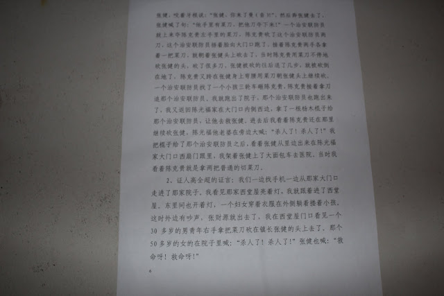 5·荒唐的证据:还记得06年陈光诚案判决书的第9条证据是证人刘长生的证言。他证明看到陈光军在案发现场砸车,事实是:这一晚刘长生在300多里外的缁博打工。陈光军也在临沂打工。两人皆不再沂南县东师古村。而砸车事实发生在东师古村。对陈克贵案的证人证言大多是政府的利害关系人,或者说同是侵害者,蛇鼠一窝。例如证人王运庆是双堠镇的副书记……这些人的证言根本不具备法律效力,不值一驳。而任宗举(克贵的母亲,不识字)的证言,则是在警察:“叫你签你就签,不签就让你死在这里。反正你没有人权了”的恐吓之下,违心按下的手印。就像杨白劳的手印也确是他本人的无异。其实,任宗举说:“这都是他们编的,我从未说过这样的话。”克贵离家后,由身着制服的公安、党政官员、雇来的流氓所组成的混合编队第三次闯入我家将正在给孙子喂药的陈克贵的妈妈抓着头发从床上脱下来进行报复性殴打。此时,克贵妈妈不断喊:“救命啊,救命啊,打死人了。”疯狂的暴徒们边打边说:“我叫你喊救命,我叫你喊救命……”这喊声邻居们都听到了。所谓克贵的自述不难看出是一点点诱供拼凑的。若克贵所说属实,张建不应该只是被砍20余刀,显然克贵的供述既不符合实事,也不是本人的意愿。这漏洞百出的供述,法院居然采纳且克贵当庭“认可”,背后隐藏多少徇权枉法和屈打成招的秘密。陈克贵的供词说“当时张建和他带领的人都空着手。”这样的自述根本不符合实事。用来打陈可贵的洋搞把都被打折了,陈克贵怎么能做出这样的供述呢。